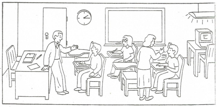 Il y a un stylo, un livre, et un papier sur le bureau (desk) du professeur.