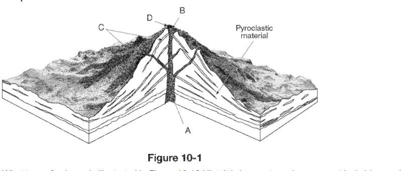 What type of volcano is illustrated in Figure 10-1? Hint: it is large, steep, has symmetrical sides, and has alternate layers of lava and pyroclastic material?