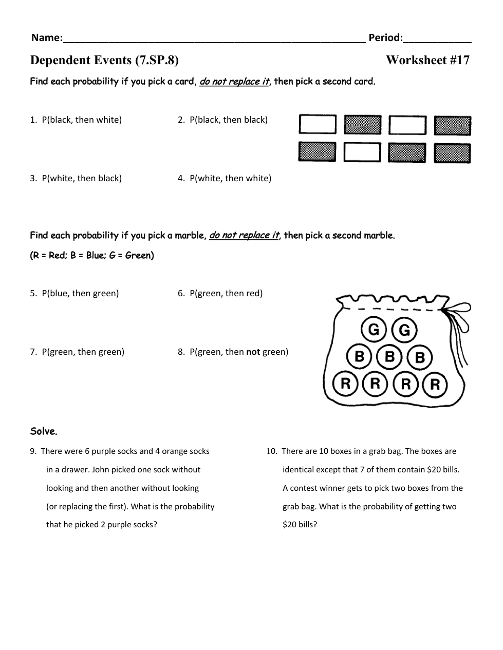 Find each probability if you pick a card, do not replace it, then pick a second card.P(black, then white)Write your answer as a fraction.