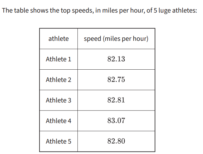 There was a sixth athlete who was faster than the rider at 82.80 mph, but slower than the rider at 82.81 mph. What could the speeds of the 3 athletes be if all measured to the nearest thousandth of a mile per hour?