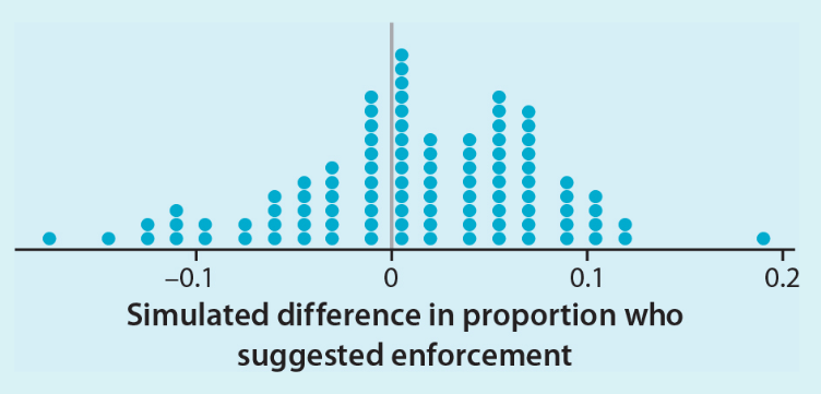 One hundred trials of a simulation were performed to see what differences in proportions are likely to occur due only to chance variation in the random assignment, assuming that the type of metaphor didn’t matter.