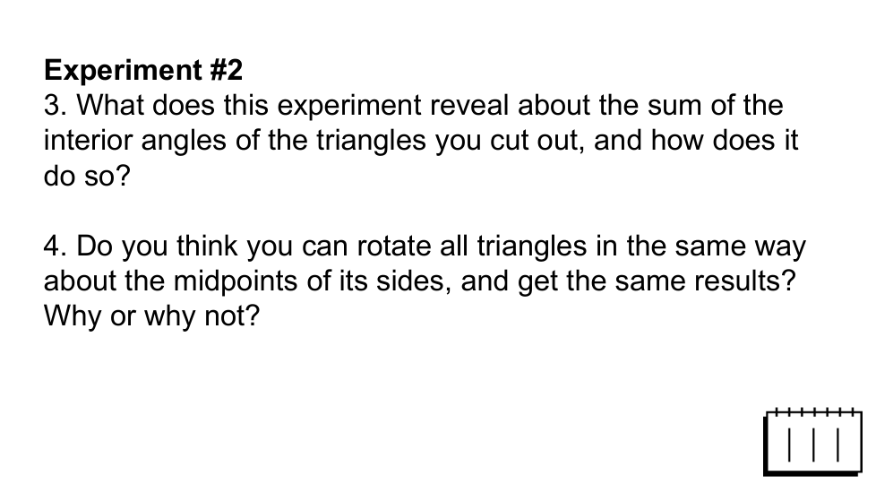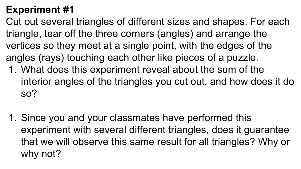 Since you and your classmates have performed this experiment with several different triangles, does it guarantee that we will observe this same result for all triangles? Why or why not?