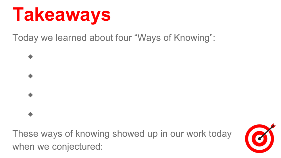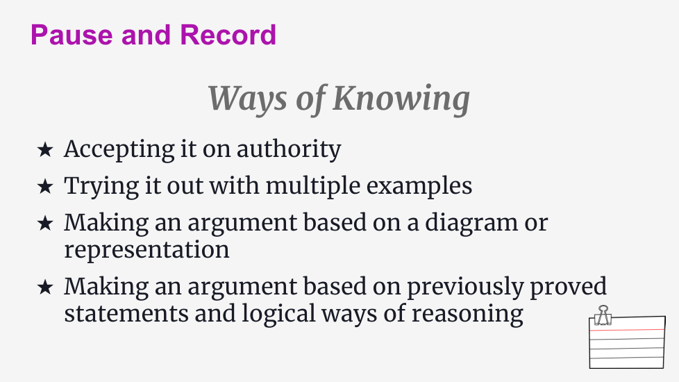 There are four “ways of knowing” that were discussed as part of today’s lesson. They are “knowing” based on: Authority, Examples, Diagrams, and Logical Reasoning.