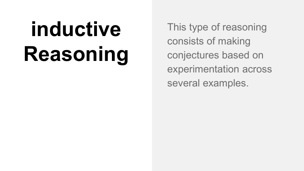 Razonamiento inductivo: este tipo de razonamiento consiste en hacer conjeturas basadas en la experimentación a través de varios ejemplos.