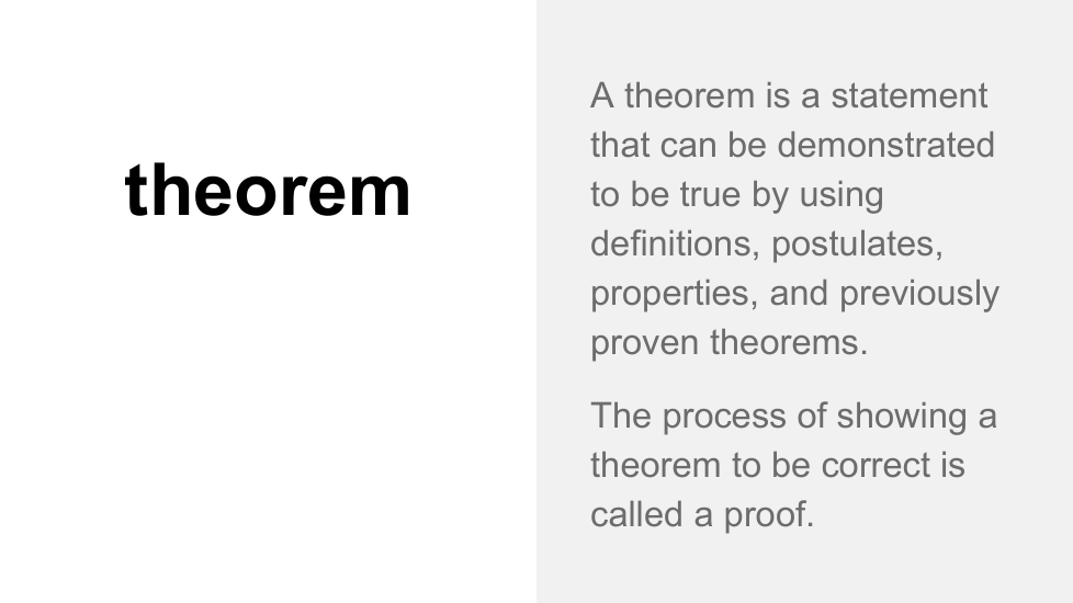 Un teorema es una declaración que se puede demostrar que es verdadera mediante el uso de definiciones, postulados, propiedades y teoremas probados previamente.