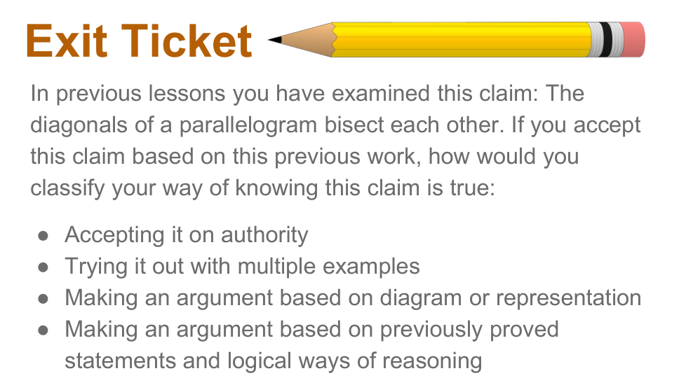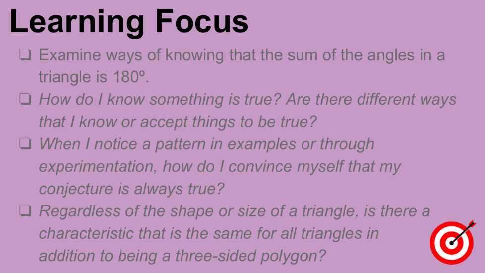 In this lesson, we explored different ways of knowing if something is true, such as basing our knowledge on being told by someone in authority, versus basing our knowledge on experimentation or reasoning with a diagram. We examined these ways of knowing in the context of justifying how we know that the sum of the angles in a triangle is 180o.