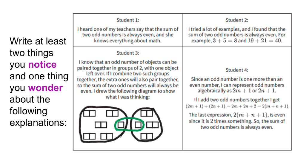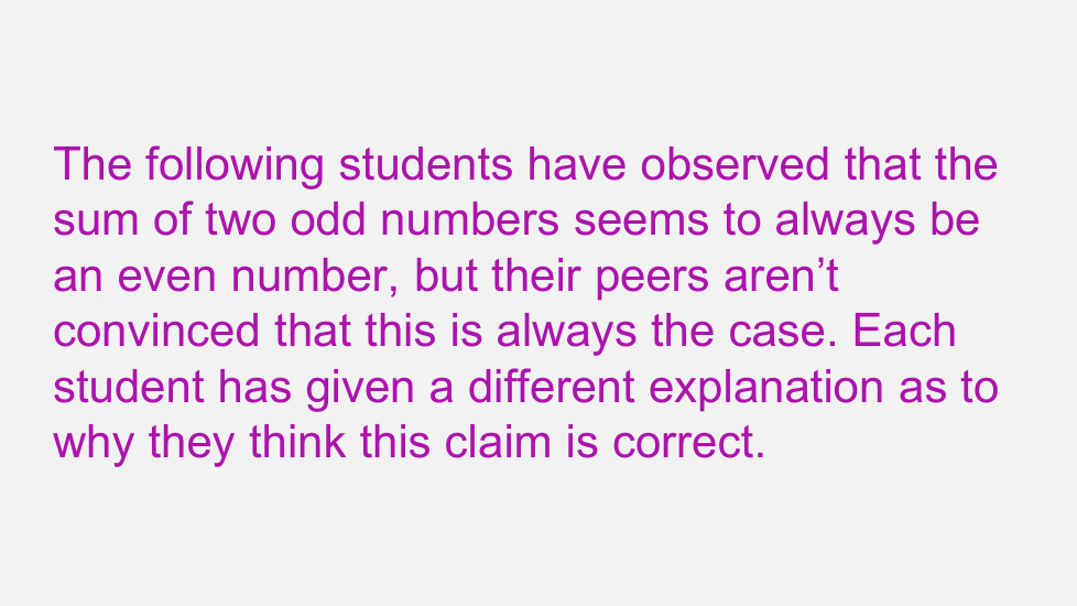 Los siguientes estudiantes han observado que la suma de dos números impares siempre parece ser un número par, pero sus compañeros no están convencidos de que siempre sea así. Cada estudiante ha dado una explicación diferente de por qué cree que esta afirmación es correcta.
