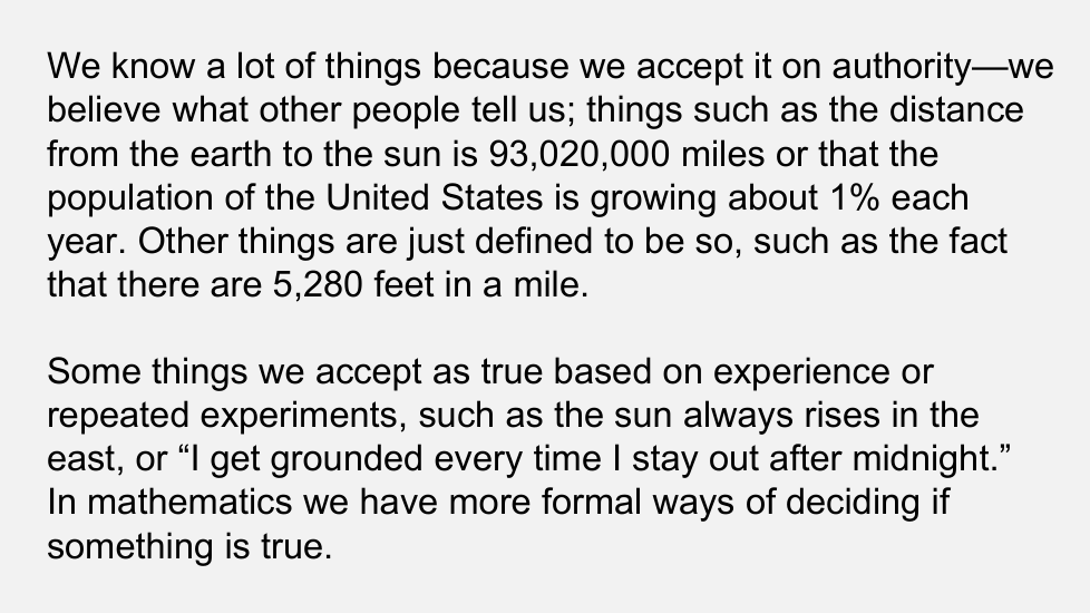 Algunas cosas las aceptamos como verdaderas basándonos en la experiencia o en experimentos repetidos, como que el sol siempre sale por el este o “me castigan cada vez que salgo después de la medianoche”. En matemáticas tenemos formas más formales de decidir si algo es verdadero.