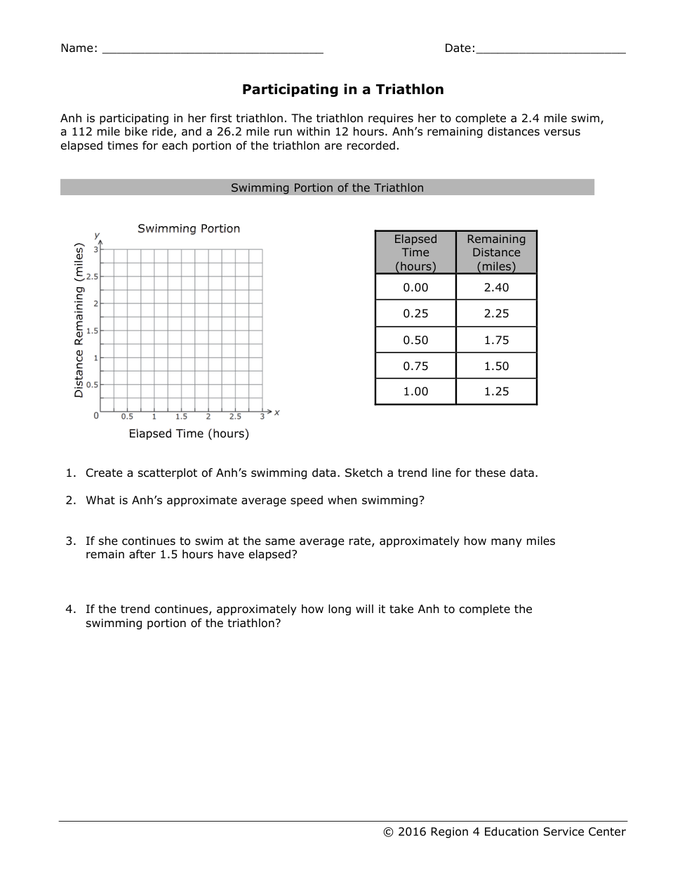 Create a scatterplot of Anh’s swimming data. Sketch a trend line for these data.