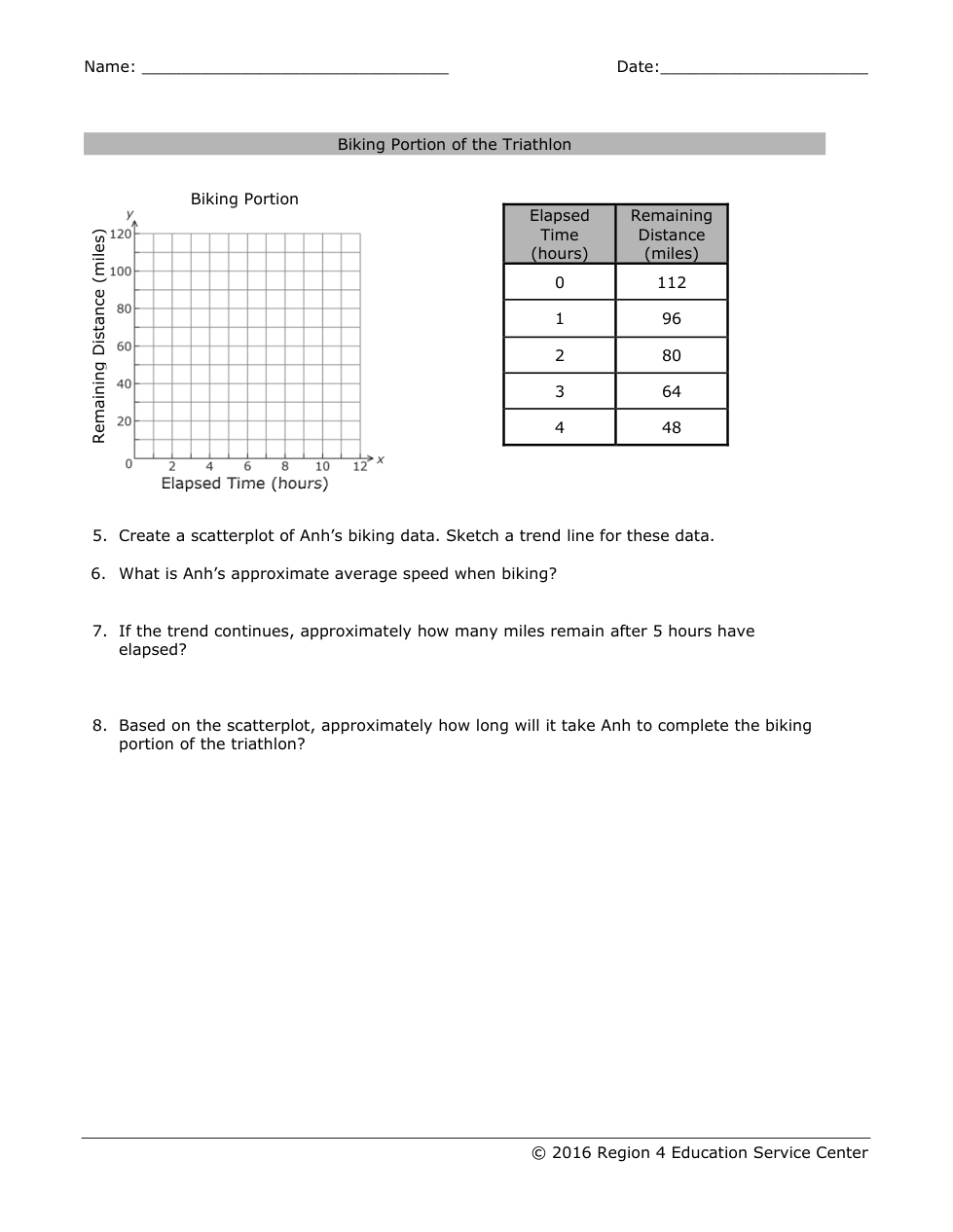 Create a scatterplot of Anh’s biking data. Sketch a trend line for these data.