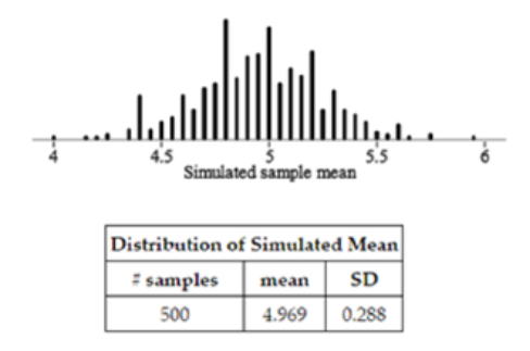 The dotplot below shows the distribution of the sample mean hours of TV watched for 500 random samples of size 25 taken with replacement from the original sample.