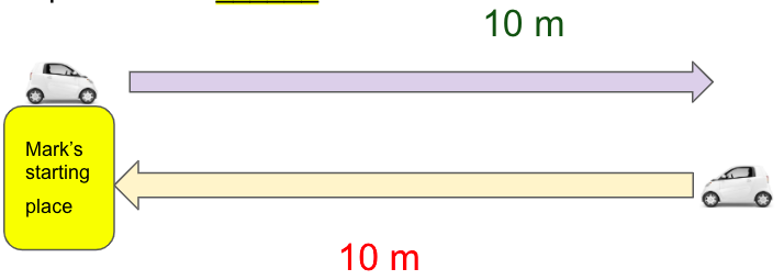 Mark drives 10 m East but forgot his cells phone so he had to drive 10 m back home? What is his displacement?