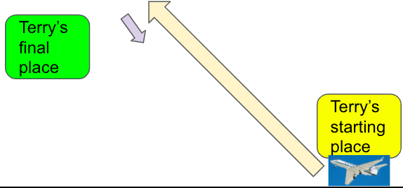 Terry flew 400 miles northwest and then drove 20 miles southeast from that destination. What is Terry’s displacement?