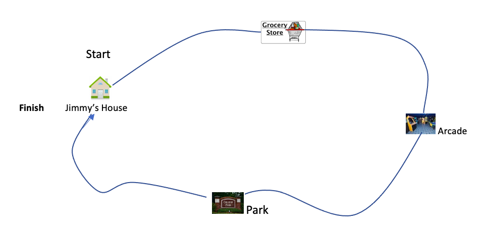 Jimmy leaves his house and goes to the grocery store (2 miles). Then jimmy goes to the arcade (4 miles). Then jimmy goes to the park (2 miles). Then jimmy goes home (3.5 miles). What is jimmy’s displacement and explain how you got that answer.