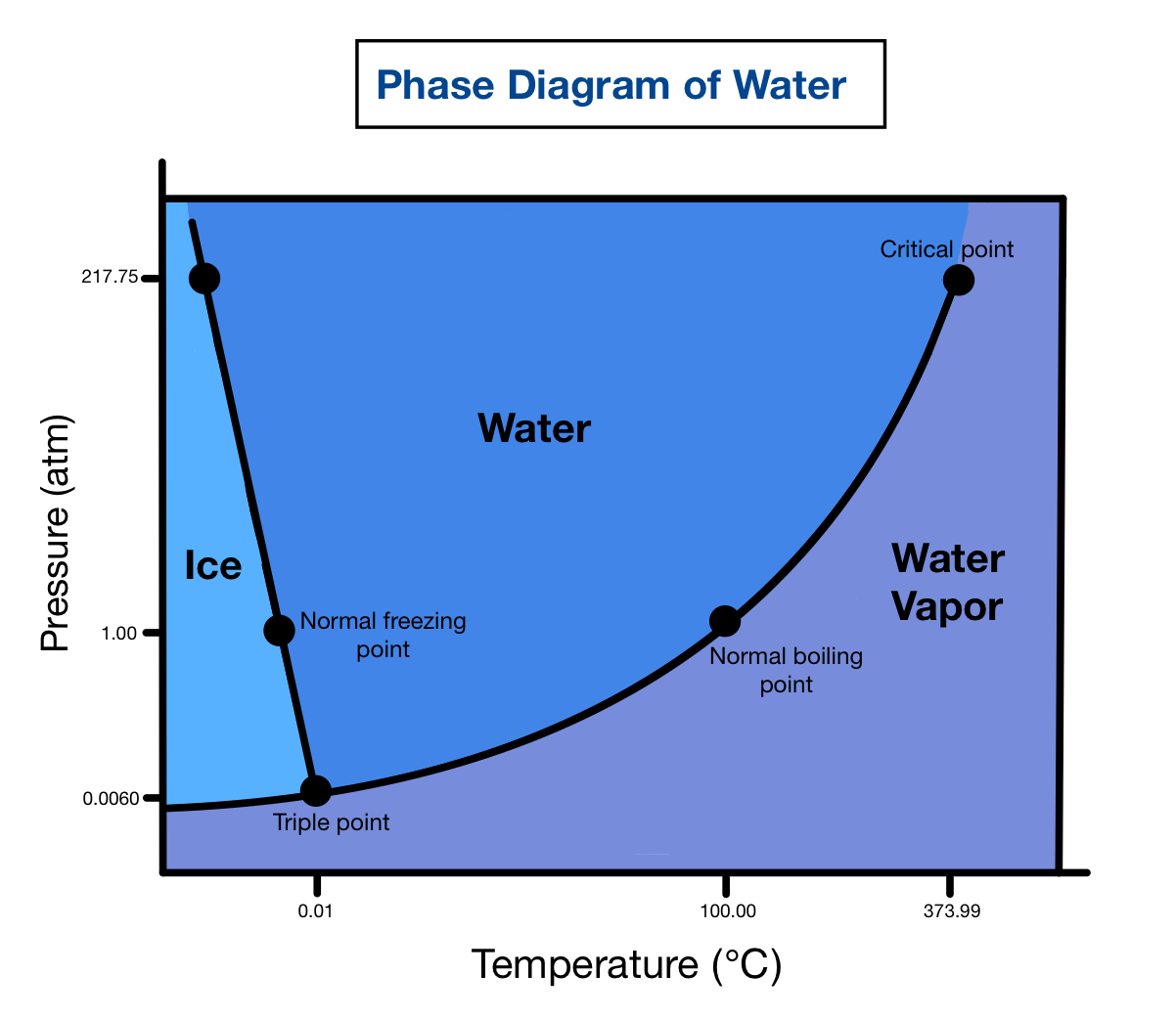 Based on the diagram, what temperature will water freeze at 0.0010 atm of pressure?