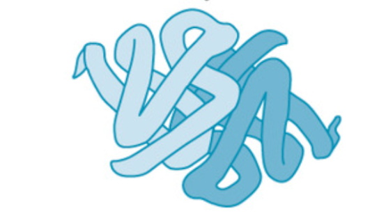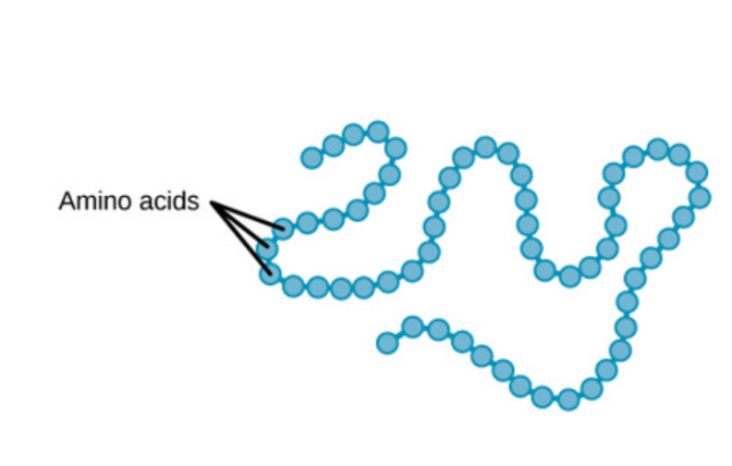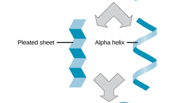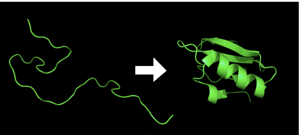 Describe the process (shown below) of how the unfolded chain of amino acids goes through its folding process to become the final folded protein seen to the right of the arrow.