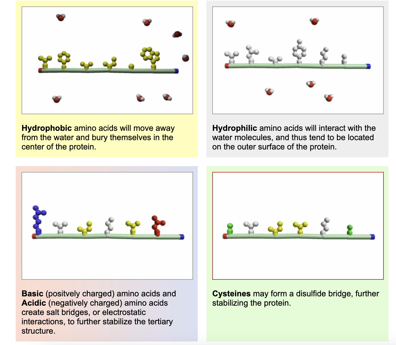 Click on the upper left box and watch the animation and then look at the protein to the right in the display box .... Explain what happens to the hydrophobic amino acids when a protein folds