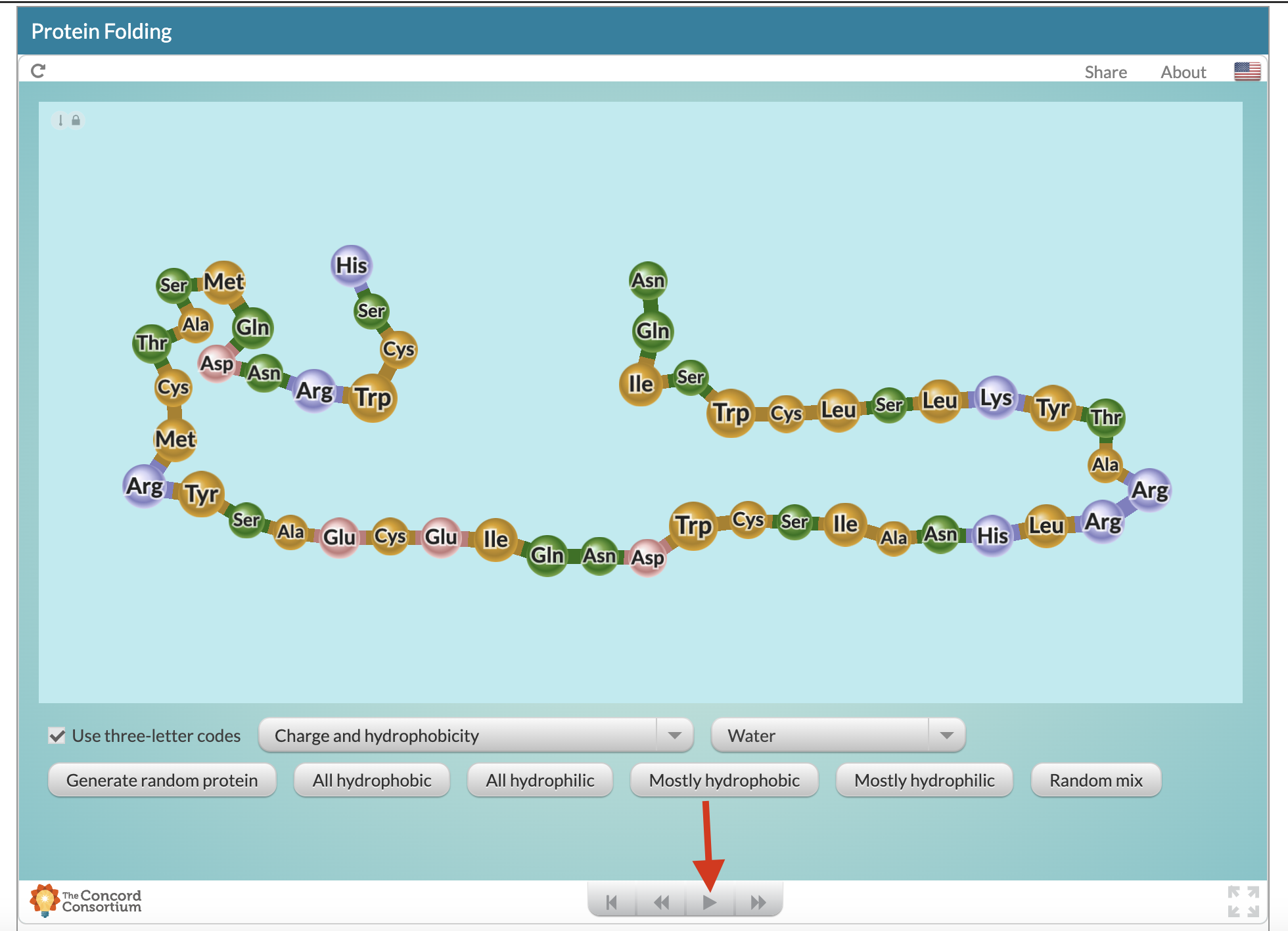 Then hit the play button - see red arrow - once the protein folds, pause the animation and answer the questions below...