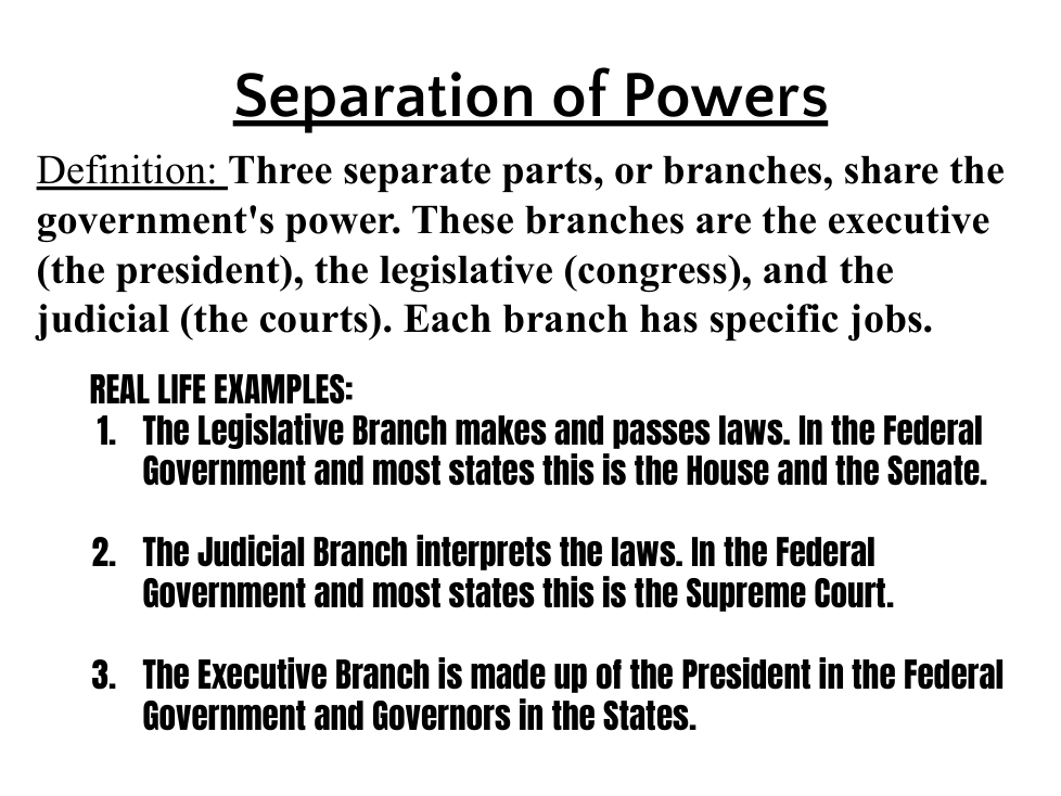 Separation of powers | arrow_right_alt | power is split between the states and federal government |