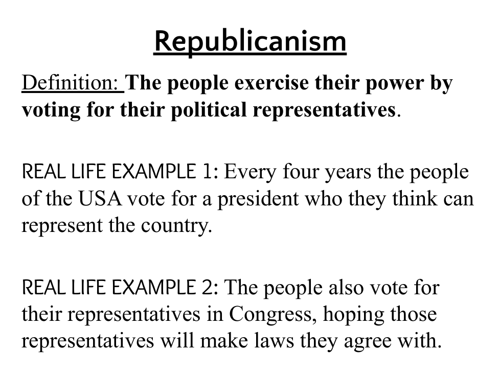 Republicanism | arrow_right_alt | electing representatives to represent you |