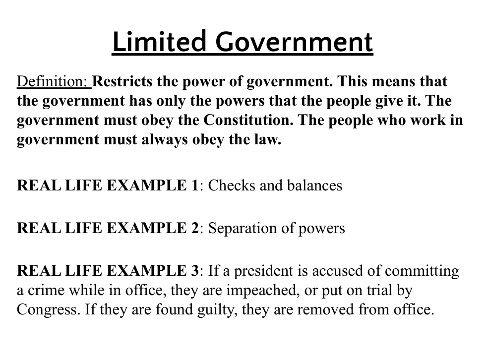 Limited government | arrow_right_alt | government power is divided among three main groups |