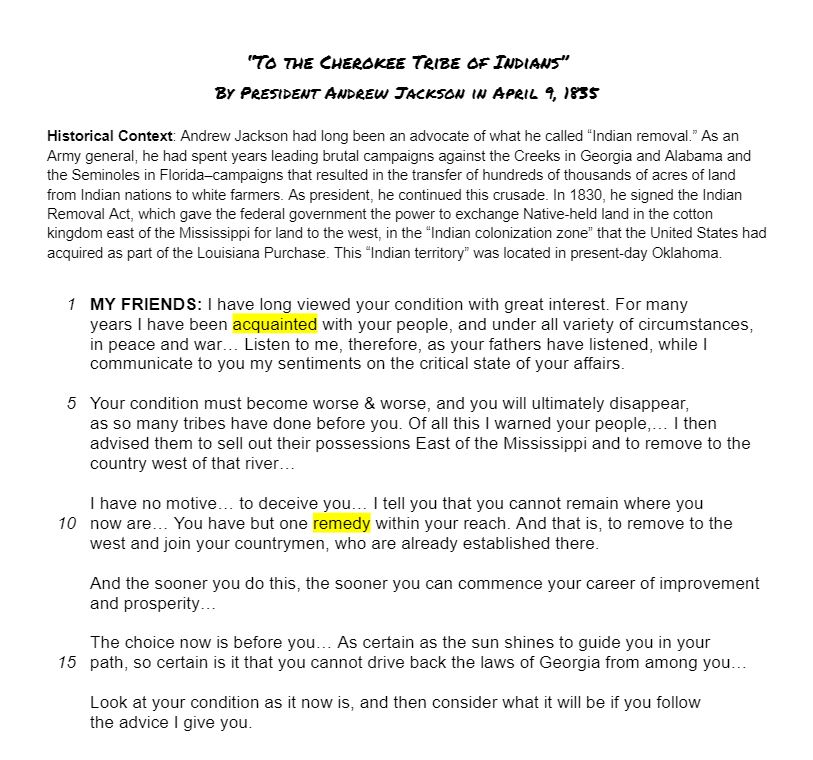 Jackson's overall message to the Cherokee Nation is that ________________. My claim is supported by the text when Jackson states, "___________________________."