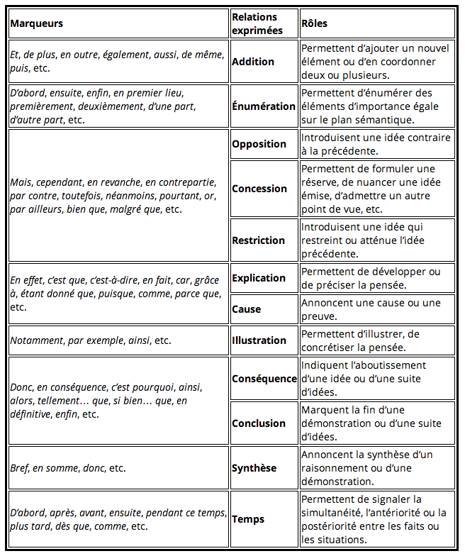 Prends connaissance du tableau ci-dessous (du site: Alloprof) qui énumère plusieurs marqueurs de relation.