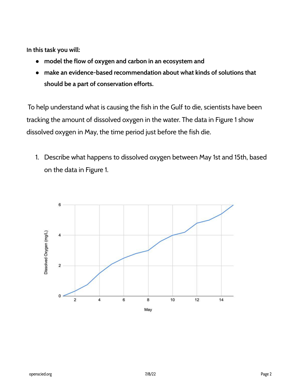 Describe what happens to the dissolved oxygen (the oxygen that is in the water) between May 1st and 15th based on the data in Figure 1.