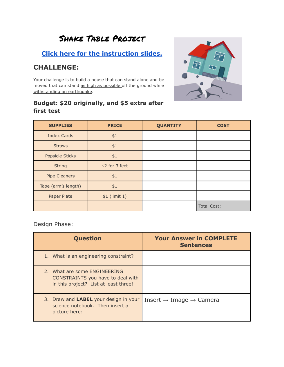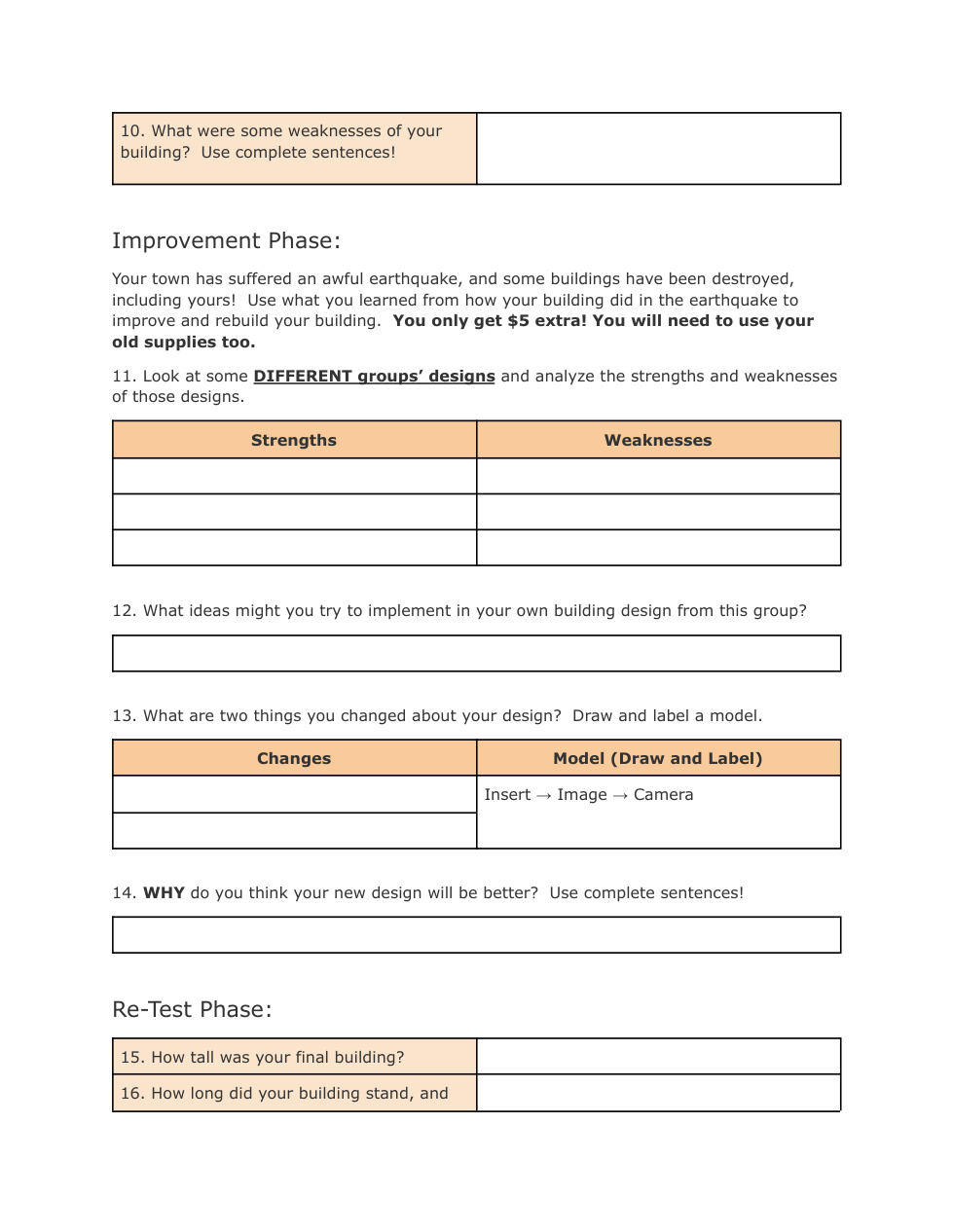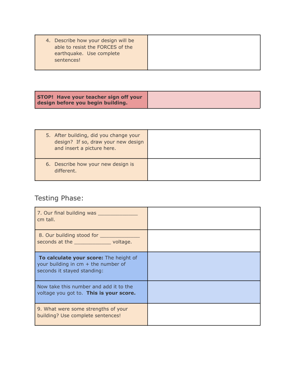 This is an enhanced worksheet to guide students through the engineering process of building a structure to withstand an earthquake.