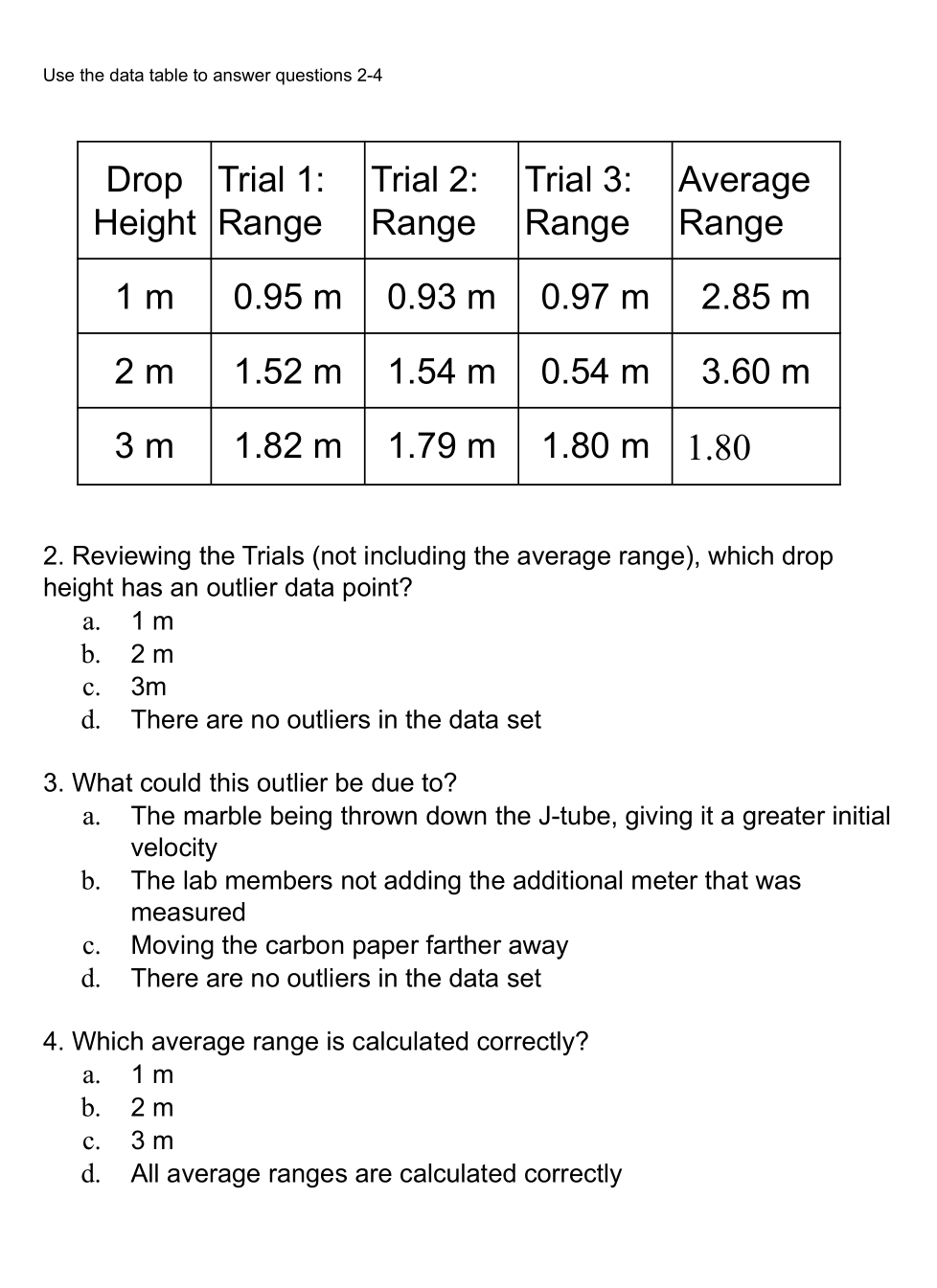 Reviewing the Trials (not including the average range), which drop height has an outlier data point?