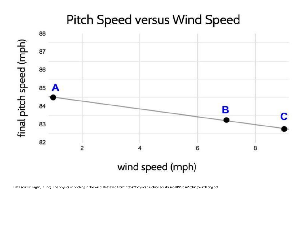 Shown is a graph that shows how pitch speed is affected by wind speed. The line on the graph shows the general relationship between wind speed and pitch speed. Points A, B, and C represent three of the same type of fast pitch all thrown at the same initial speed from a pitcher’s fingertips, but under different wind conditions.