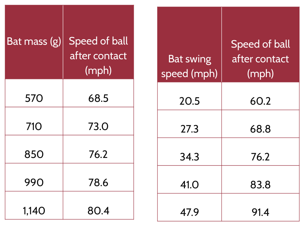 Use the data from the tables to determine which has a bigger effect on speed of the ball after it is hit; increases in the mass of a bat or increases in the swing speed of the bat. You may want to use calculations or graphing to determine which has a bigger effect. (Remember when we doubled or tripled the mass of the cart and graphed the resulting change in KE? and when we doubled or tripled the speed of the cart and graphed the resulting change in KE? What patterns can you find in this bat data, using the same approach?)