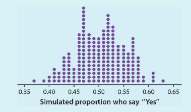 The dotplot below shows the results of a simulation taking 200 SRSs of 100 students from a population in which the true proportion who recycle is 0.50.