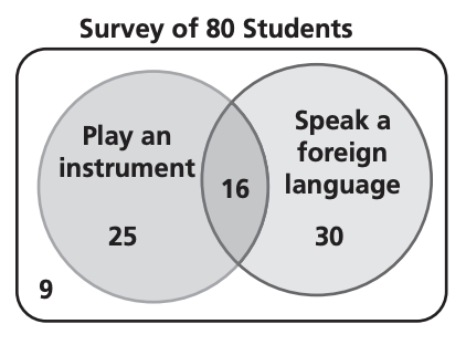 The Venn diagram shows the results of a survey in which 80 students were asked whether they play a musical instrument and whether they speak a foreign language.