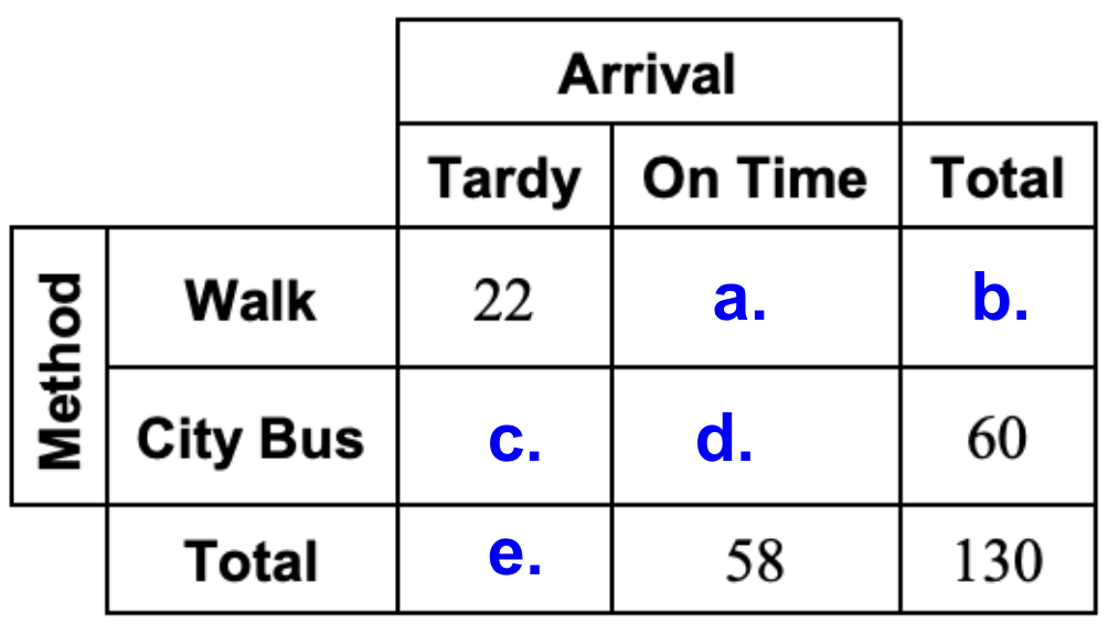e. Find P(On Time or City Bus) = _______ Hint: use the General Addition Rule