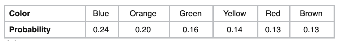 Suppose you tear open the corner of a bag of M&M’S® Milk Chocolate Candies, pour one candy into your hand, and observe the color. According to Mars, Incorporated, the maker of M&M’S, the probability model is