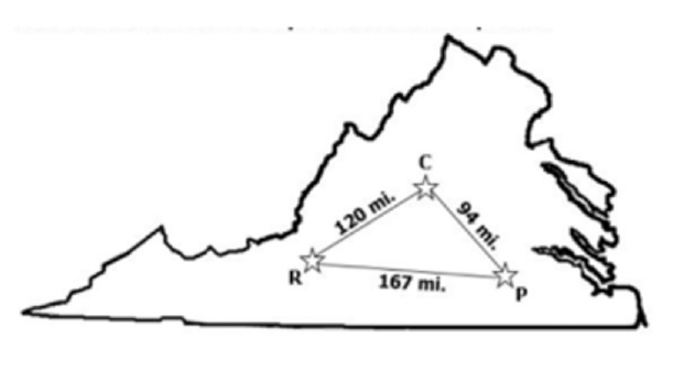 Roanoke (R), Charlottesville (C), and Petersburg (P), from a triangle and the distance between the three cities are represented on the map below.