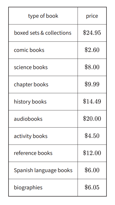 Imagine you are selling exactly 15 books total at the book fair. Write a structured list or table of how many of each type of book you choose.