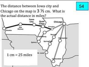 The distance between Iowa City and Chicago on the map is 3 1/5 cm. What is the actual distance in miles? (Don't forget units)
