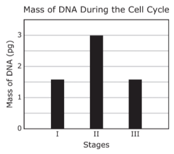 Scientists determine the total mass of DNA from a sample of animal cells. The masses of equal numbers of cells were taken during three different stages of the cell cycle. Stage I contains cells massed during G1 of the cell cycle.