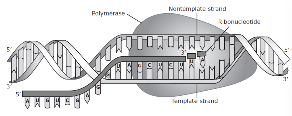 The process represented in the diagram produces a molecule that is complementary to the template strand of DNA. What type of molecule is produced?