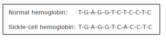 Sickle-shaped red blood cells result from a mutation in the gene that codes or hemoglobin. This mutation results in sickle-cell anemia. A partial sequence of bases from a normal hemoglobin gene and a sequence that results in sickle-cell anemia are shown below.