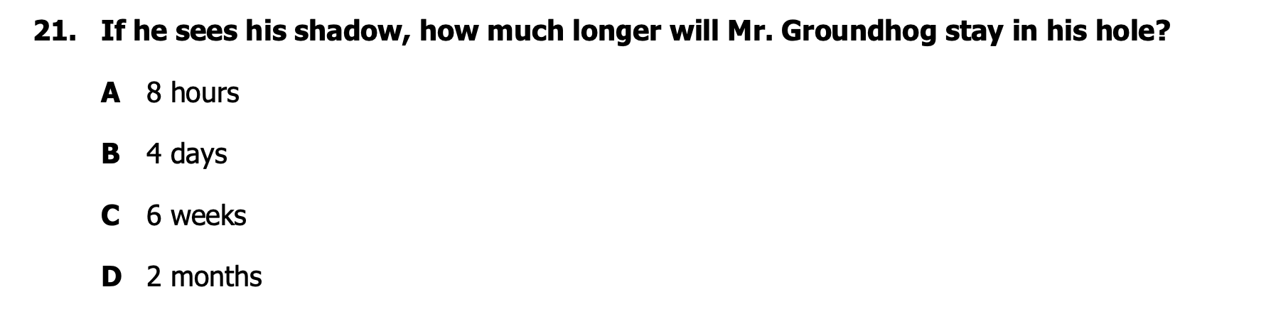 If he sees his shadow, how much longer will Mr. Groundhog stay in his hole?