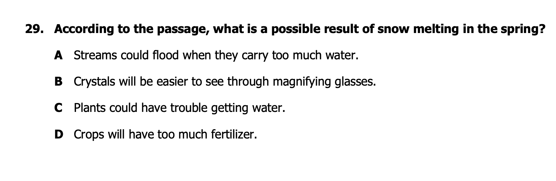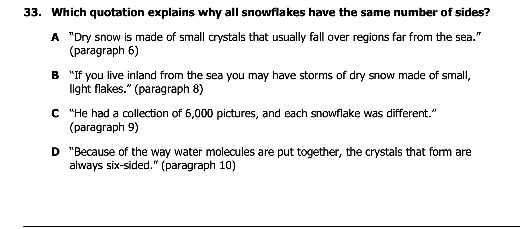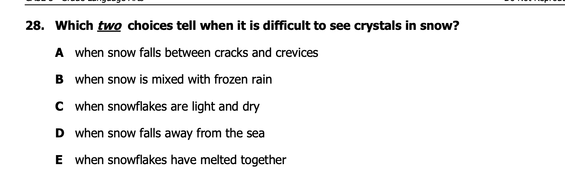 Which TWO choices tell when it is difficult to see crystals in snow?