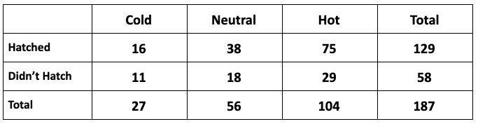 If we randomly select an egg, find the probability that the egg didn't hatch given that it was in cold temperature: P(didn't hatch|Cold)=