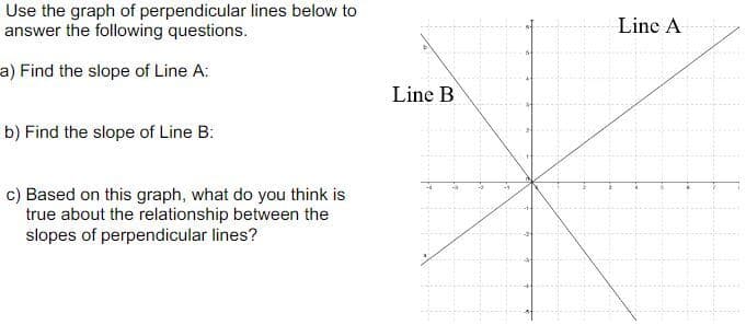 Lines A and B are perpendicular to eachother. This means that they intersect at a right (90 degree) angle. What do you think is true about the relationship between the slopes of perpendicular lines?