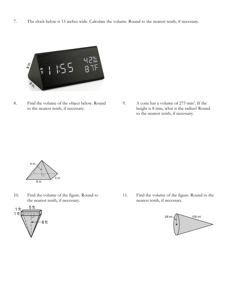 A cone has a volume of 275 mm3. If the height is 8 mm, the radius must be ____ mm? Round to the nearest tenth, if necessary.