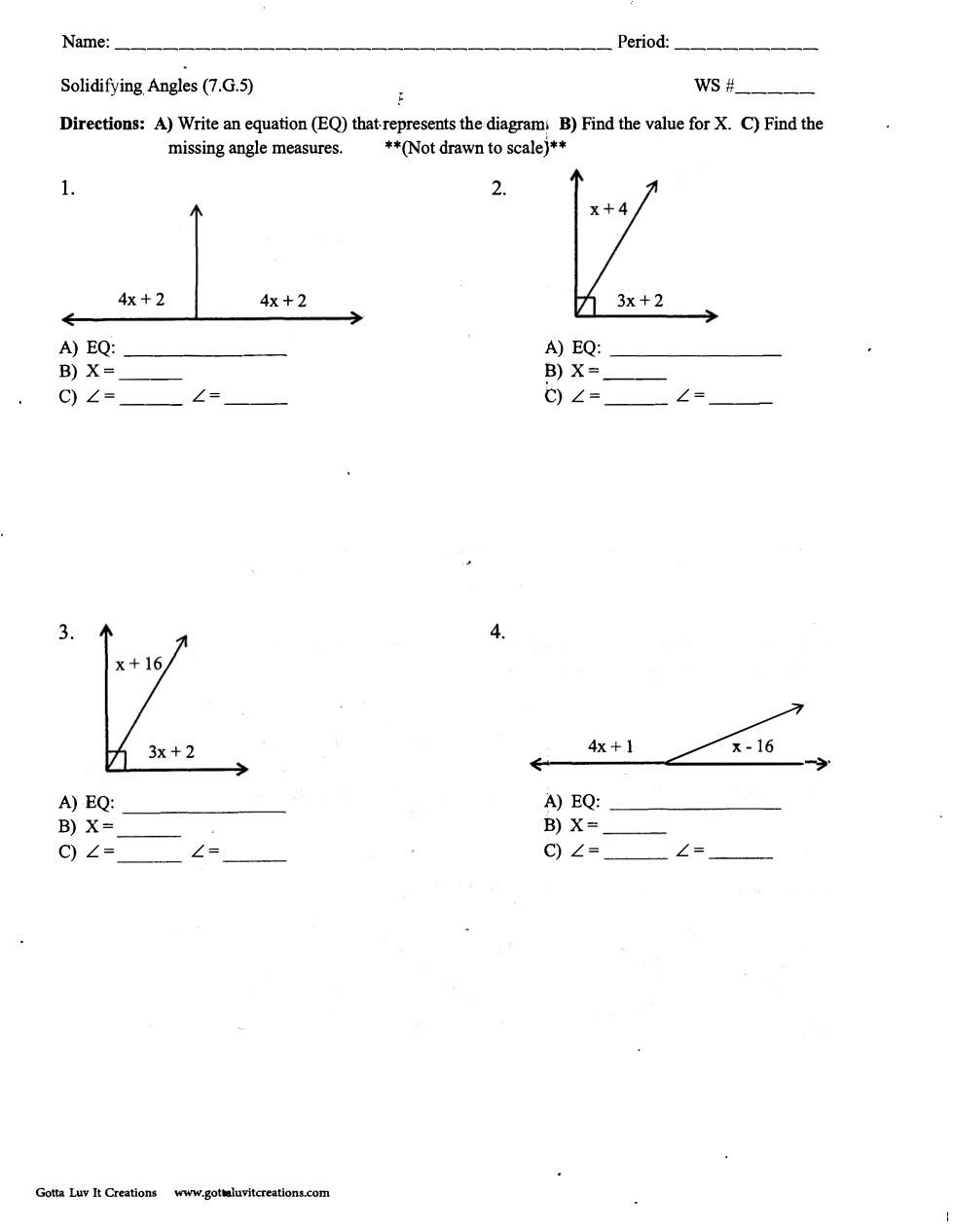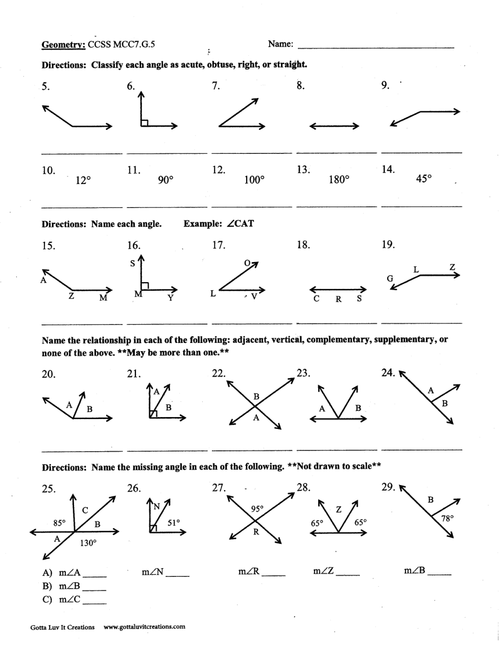 Name the relationship in each of the following as adjacent, vertical, complementary, supplementary, or none of the above. **Hint: Some may be more than one.**