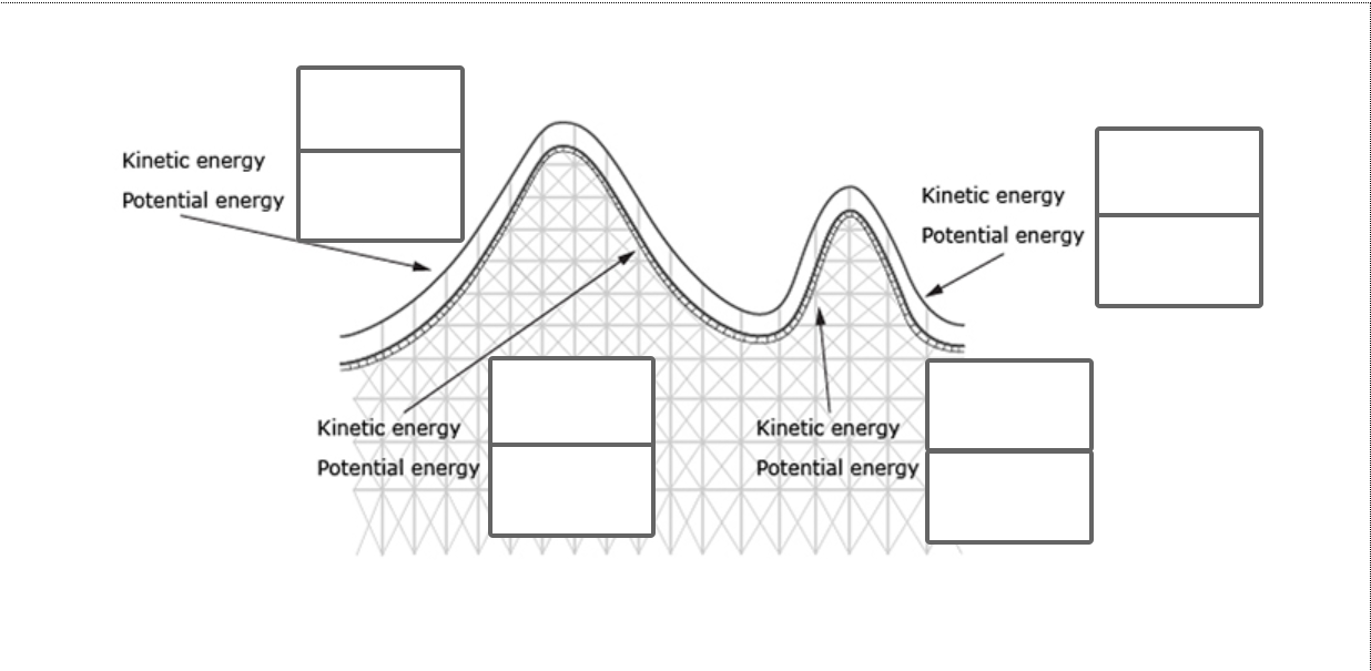 A rollercoaster car moves from left to right as shown. The car starts out with high velocity as it is launched at the gate and no additional energy is provided during the part of the roller coaster shown. Determine whether the car is gaining or losing kinetic and potential energy at each part of the rollercoaster.