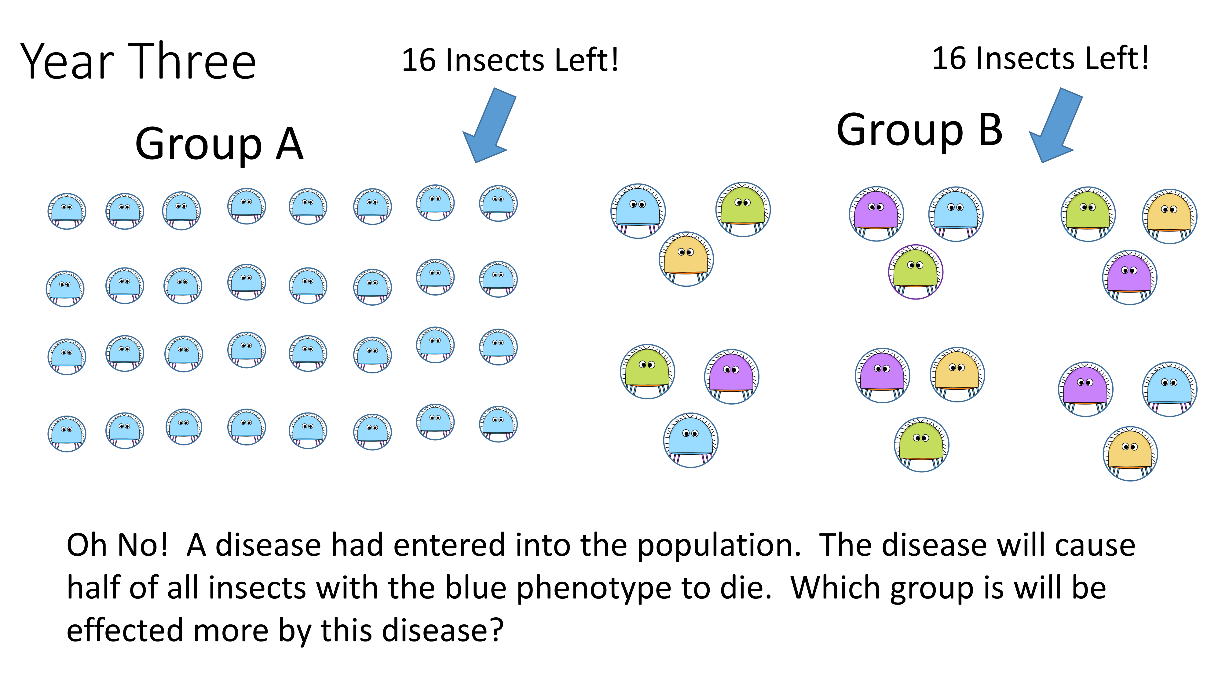 At year 3, a disease entered the population killing half the insects with blue color to die. Which group will be effected more by this disease?